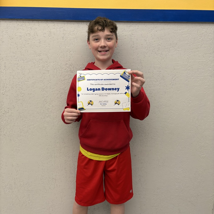 A student in Mr. Hutley's keyboarding class was given a certificate for completing 1,868 keyboarding lessons in only 12 weeks of school. Throughout the process of completing all of these lessons, he averaged 85WPM with 92% accuracy! Great job, Logan!